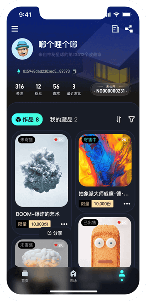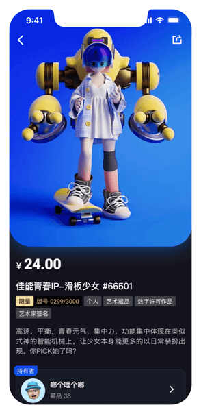 支持展示藏品详情信息及创作者简介,查看藏品历史交易记录,可限量发布藏品。