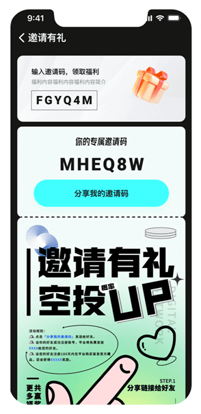 自动生成专属邀请码,复制分享给好友获得奖励,多种营销模式。
