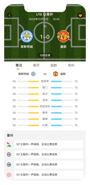 赛事数据采用第三方接口,详细展示比赛数据、比分、事件等信息。
