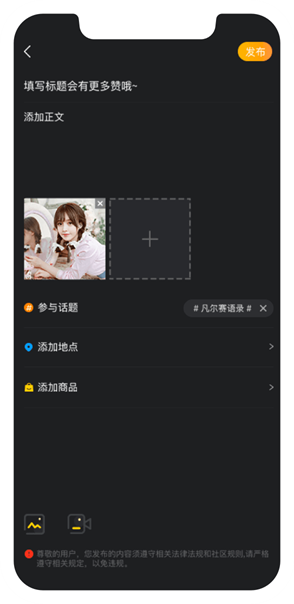 支持用户可发布文字、图片、视频笔记,显示定位,关联商品链接