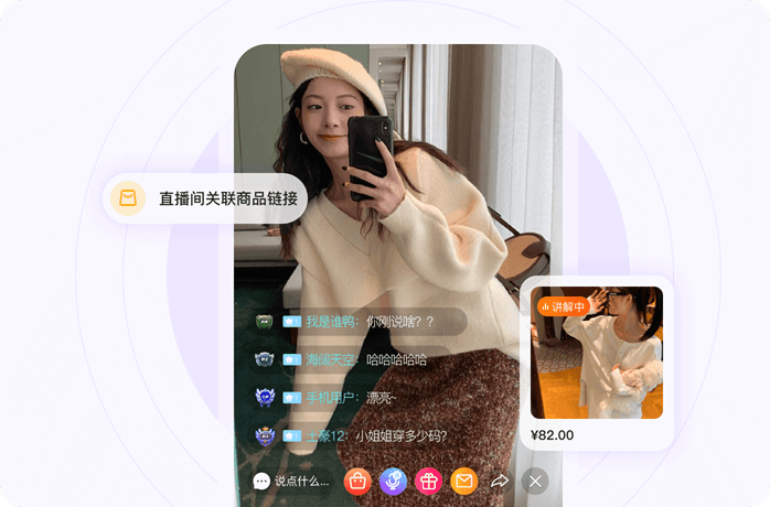 商家开通直播小店后直播间可关联店铺商品,主播实时讲解商品,用户下单后追踪订单详情、物流详情。